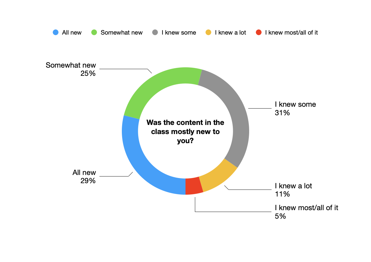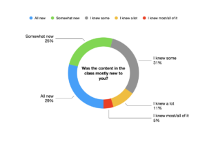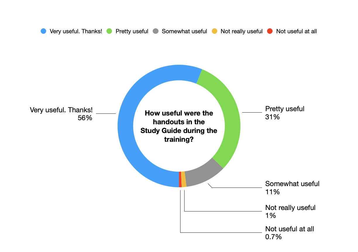 - Usefulness of handouts (56% said very useful, 31% said pretty useful)