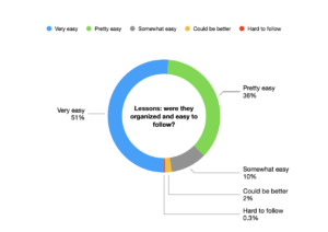 - Lessons easy to follow (51% said very easy, 36% pretty easy)