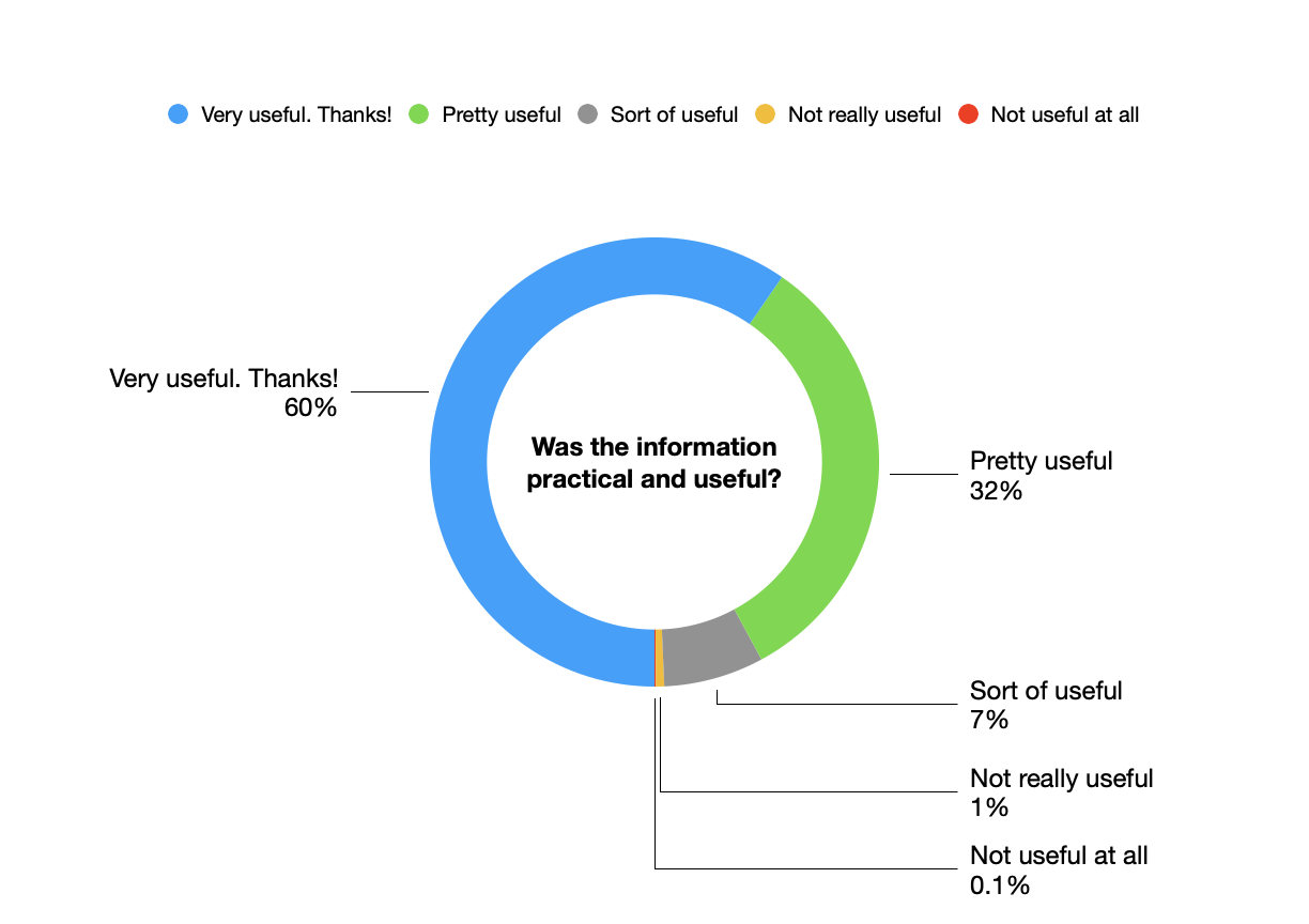 - Practical and useful information (60% said very useful, 32% said pretty useful)