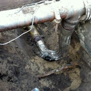 Metal product piping in contact with earth not fully isolated; yellow sleeve poorly installed and appears mostly for show