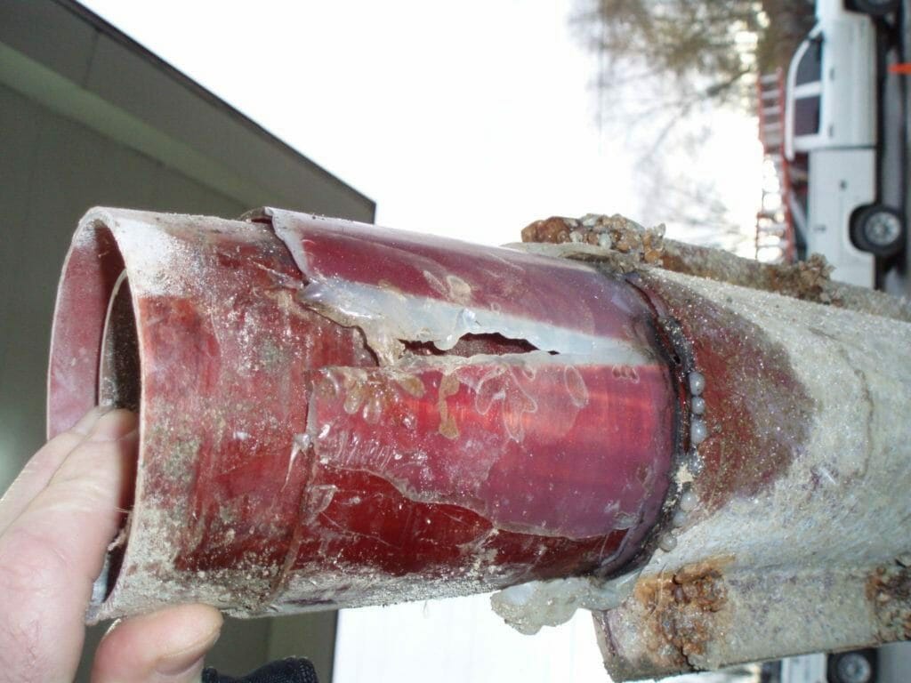 Cracked fiberglass (FRP) pipe with hardware store caulk. Not recommended.