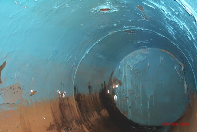 Clearly the liner company didn't line the entire tank profile as is evidenced by there being no liner from 3 o'clock to 9 o'clock. Also the jagged and drippy edges of the blue liner seen it indicate a hurried job. Liners are supposed to be applied 10 mils thickness at a time for ten times.
