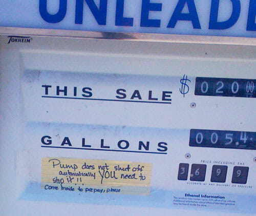 What’s wrong with this picture? Look closely at the little yellow sign. Looks like a confession for the next spill at the dispenser.
