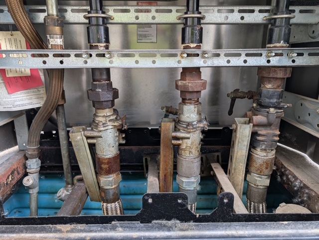 What you are looking at: There is significant rust and corrosion on numerous threaded pipe fittings and unions throughout the assembly.